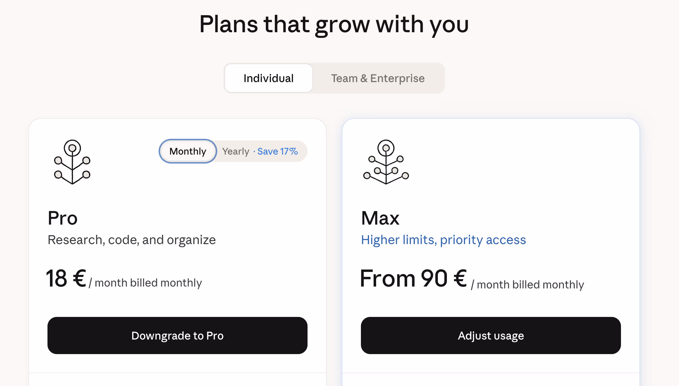 Hind: Claude Pro tellimus maksab ~€18 kuus, Claude Max ~$90 kuus sõltuvalt mahust.